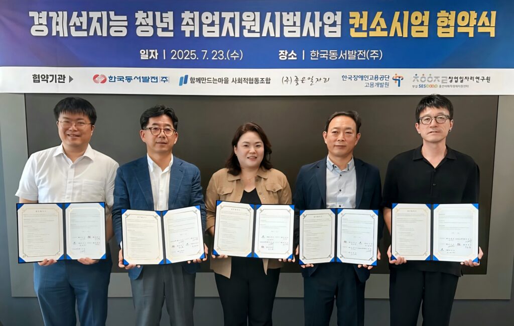 한국장애인고용공단 고용개발원(원장 직무대리 김호진)은 7월 23일 한국동서발전㈜(사장 권명호), 함께만드는마을 사회적협동조합 부설 경계선지능인지원센터(이사장 김지숙), ㈜좋은일자리(대표 박재민)와 함께 ‘경계선지능 청년의 자립역량 강화 및 사회참여 기회 확대를 위한 업무협약’을 체결했다. 협약식은 울산시 중구에 위치한 동서발전 본사 회의실에서 진행됐다.