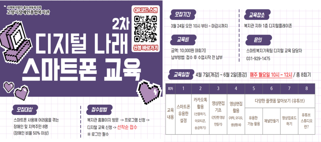 스마트폰을 보다 편리하게 사용할 수 있도록 지원하는 것을 목표로 하는 이번 교육은 고양시장애인종합복지관 디지털플레이존에서 진행한다.
