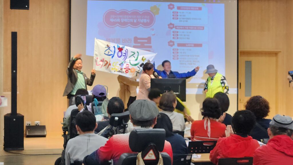 이어서 3층 강당에서 펼쳐진 노래자랑 무대에는 예선을 거쳐 올라온 7팀의 경연이 펼쳐졌다. 이날 평소에 갈고 닦은 노래실력을 뽐낸 최예진님은 “무료한 일상속에서 오늘처럼 즐거운 일들이 날마다 있었으면 좋겠어요. 장애인의 날이 아니더라도 모두 관심을 가져 주세요.” 라며 감사의 마음을 전달했다.