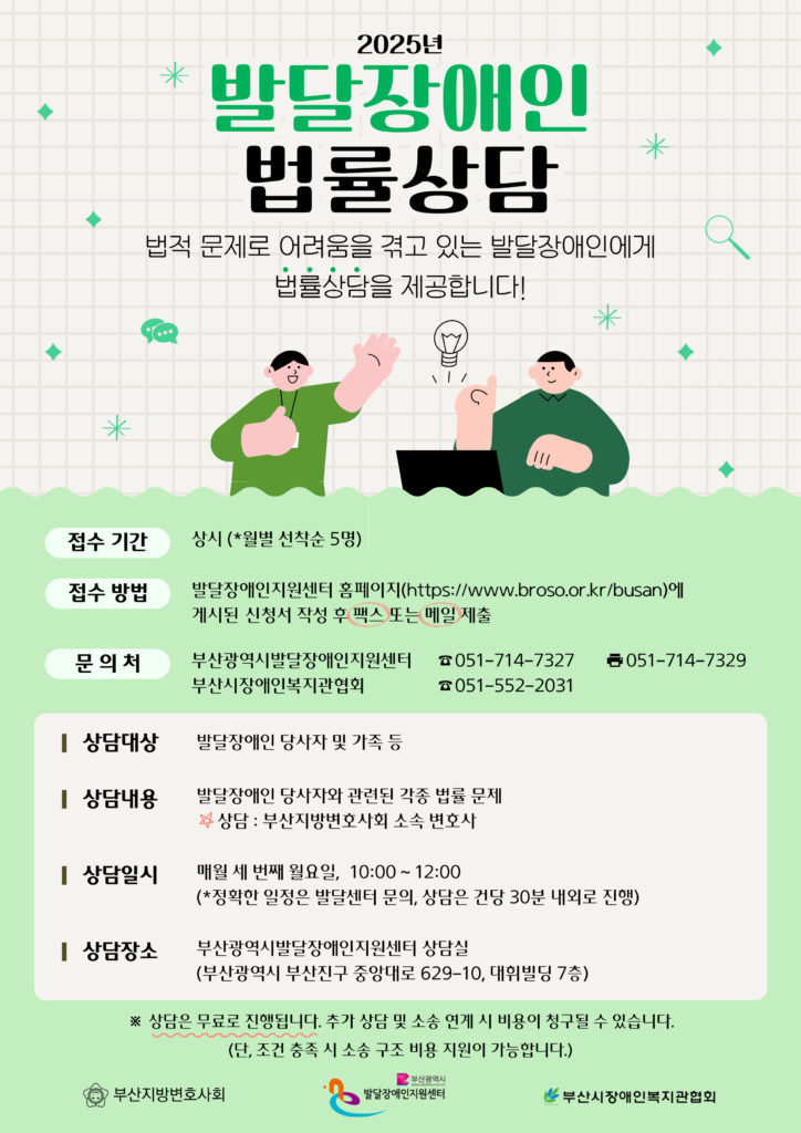 법률상담은 매월 셋째 주 월요일 부산발달센터에서 진행되며, 전국의 발달장애인과 그 가족 누구나 신청할 수 있다. 신청은 상시 접수하며, 매월 선착순 5명을 대상으로 한다.