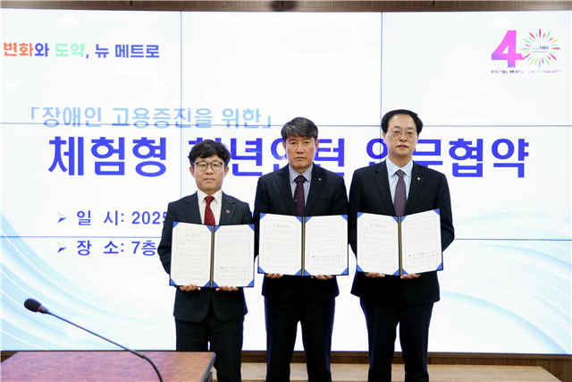 부산시가 장애 청년의 안정적인 직무 경험과 지속 가능한 고용 환경 조성을 위해 지자체, 공기업, 고용 전문기관이 함께 참여하는 체험형 청년인턴 사업을 본격 추진한다. 시는 10일 부산교통공사, 한국장애인고용공단 부산지역본부와 함께 ‘장애인 고용증진을 위한 체험형 청년인턴 업무협약’을 체결했다. 협약식은 이날 오전 부산교통공사 대회의실에서 관계 기관 대표 및 실무자 10여 명이 참석한 가운데 진행됐다.