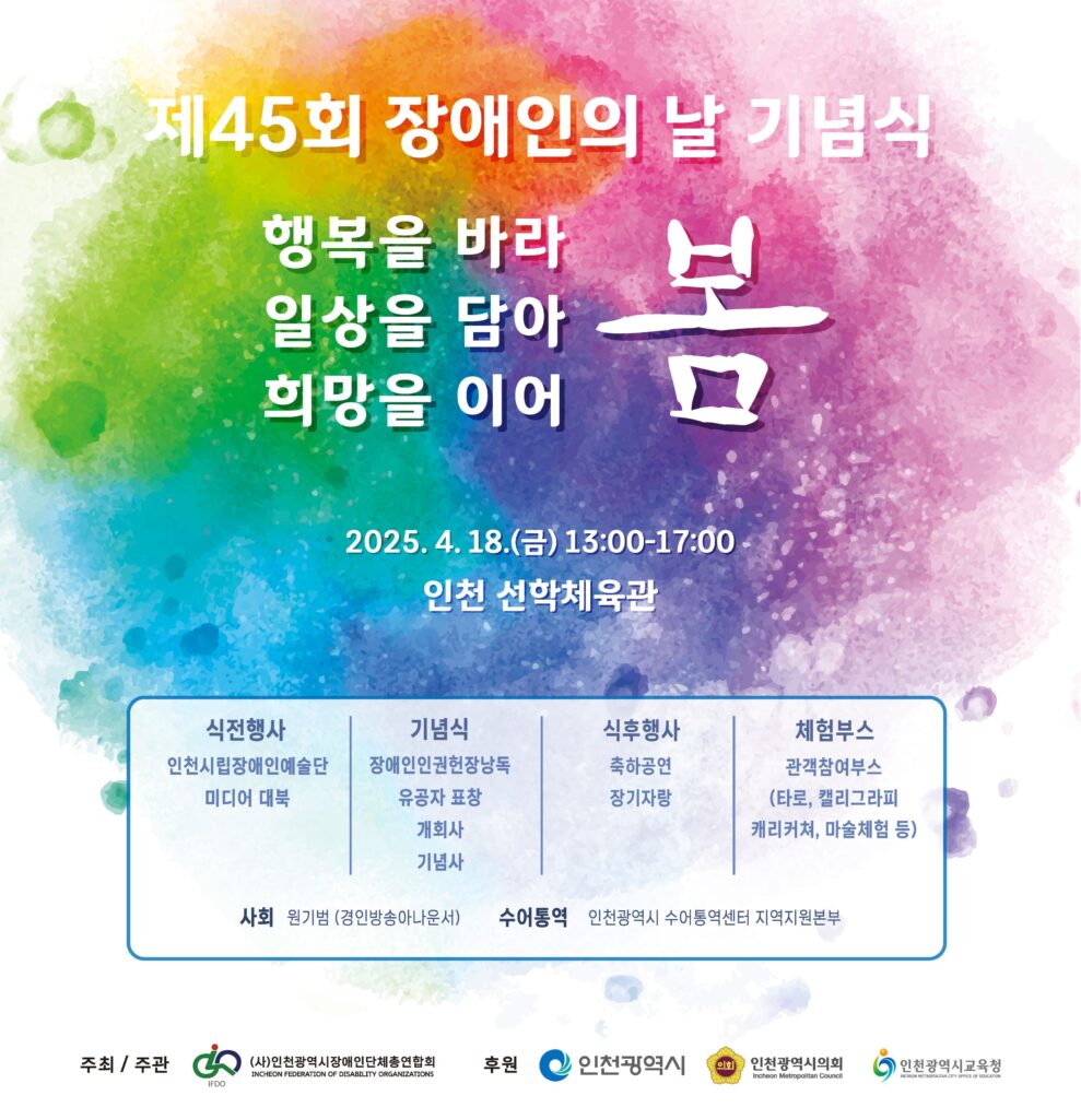 (사)인천광역시장애인단체총연합회(회장 위계수)가 주관하는 이번 행사의 슬로건은 ‘행복을 바라 봄, 일상을 담아 봄, 희망을 이어 봄’으로 정해졌으며, 장애인의 자립생활과 일상 속에서 희망을 발견하고, 모두가 함께 행복한 사회를 만들어가자는 의미를 담고 있다.