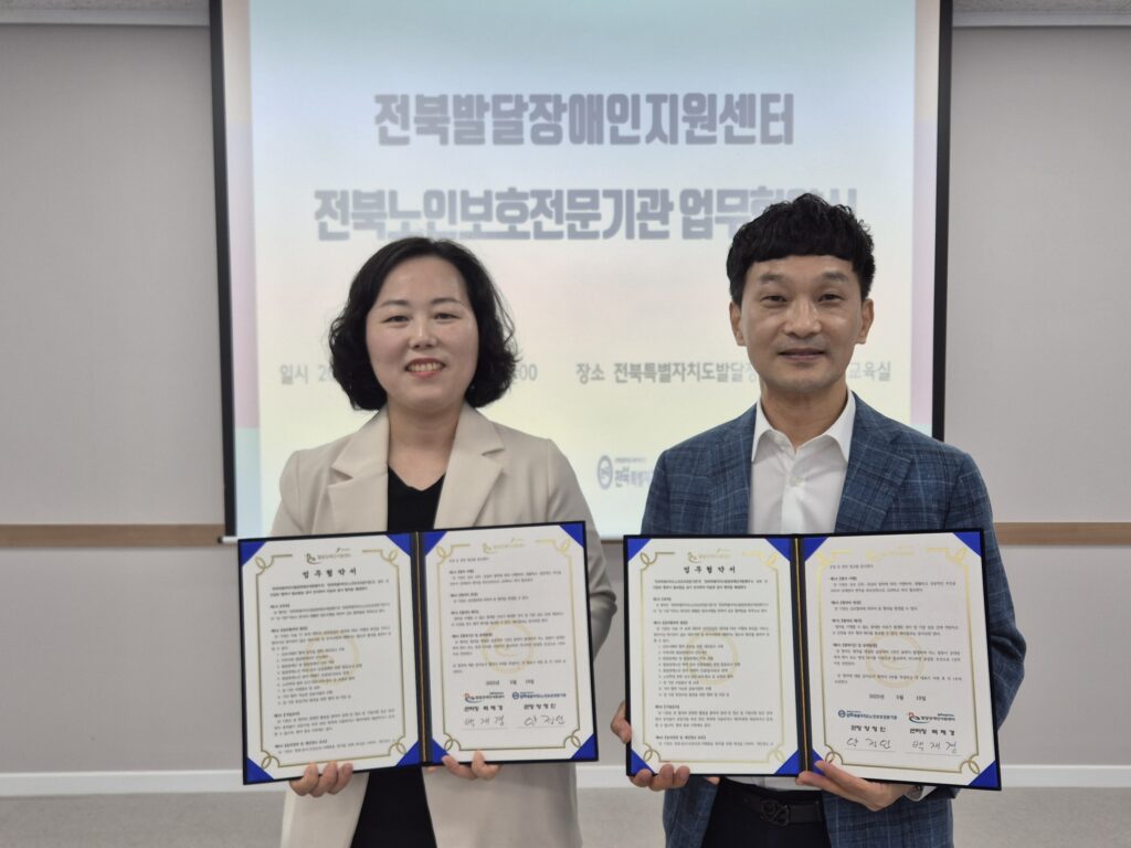 한국장애인개발원 전북특별자치도발달장애인지원센터(센터장 백재경, 이하 전북발달센터)와 전북특별자치도노인보호전문기관(관장 양정인)이 5월 19일 지역사회 발달장애인의 권익 보호와 지원 강화를 위한 업무협약을 체결했다. 협약식은 전북발달센터 교육실에서 진행됐으며, 양 기관 관계자 8명이 참석해 상호 협력 방안을 논의했다.