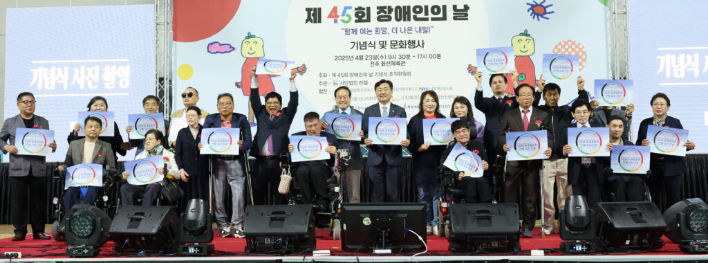 제45회 장애인의 날을 맞아 전주 화산체육관에서 ‘행복을 바라봄, 일상을 담아봄, 희망을 이어봄’이라는 슬로건 아래 기념행사가 성황리에 열렸다. 이번 행사는 (사)라엘이 주관하고 김관영 전북특별자치도지사, 서거석 전북교육감, 도의원을 비롯한 유관기관 관계자와 장애인 당사자 및 가족 등 1,300여 명이 참석해 장애인의 날의 의미를 함께 나눴다.