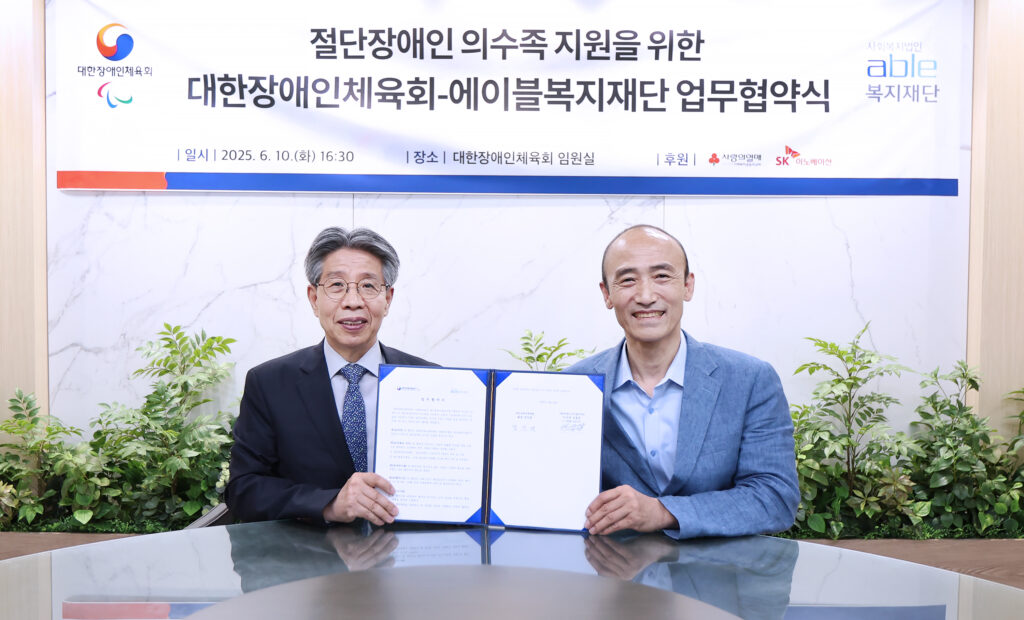 대한장애인체육회(회장 정진완)는 6월 10일 오후 4시 30분, 대한장애인체육회 임원실에서 에이블복지재단(이사장 선동윤)과 절단장애인 선수들의 스포츠 참여 확대와 맞춤형 의수족 지원을 위한 업무협약(MOU)을 체결했다. 이날 협약식에는 정진완 회장, 에이블복지재단 백종환 상임이사 및 양 기관 임직원이 참석했다.
