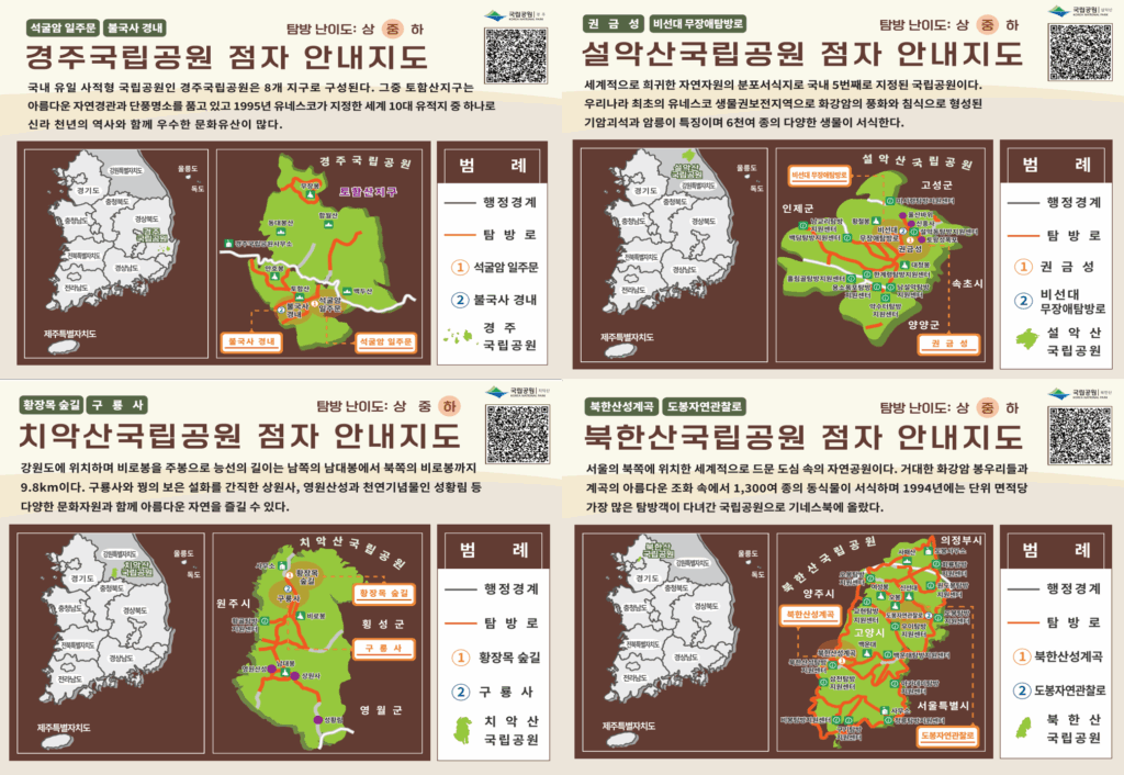 특히, 각 국립공원의 대표 생물자원과 명소에 얽힌 이야기나 설화도 함께 수록하여 단순한 공간 정보 제공을 넘어, 탐방의 재미와 흥미를 더했다.