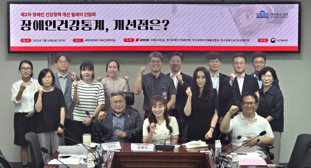장애인 건강보건 통계체계의 실효성을 높이기 위한 제2차 간담회가 지난 7월 25일 국회의원회관에서 열렸다. 이번 간담회는 한국장애인단체총연맹, 국민의힘 김예지 의원실, 한국장애인단체총연합회, 한국장애인보건의료협의회가 공동 주최한 ‘장애인 건강정책 개선 릴레이 간담회’의 일환으로, 「장애인 건강권 및 의료접근성 보장에 관한 법률」 제11조에 따른 건강보건통계사업의 현황을 점검하고 개선 방안을 논의했다.
