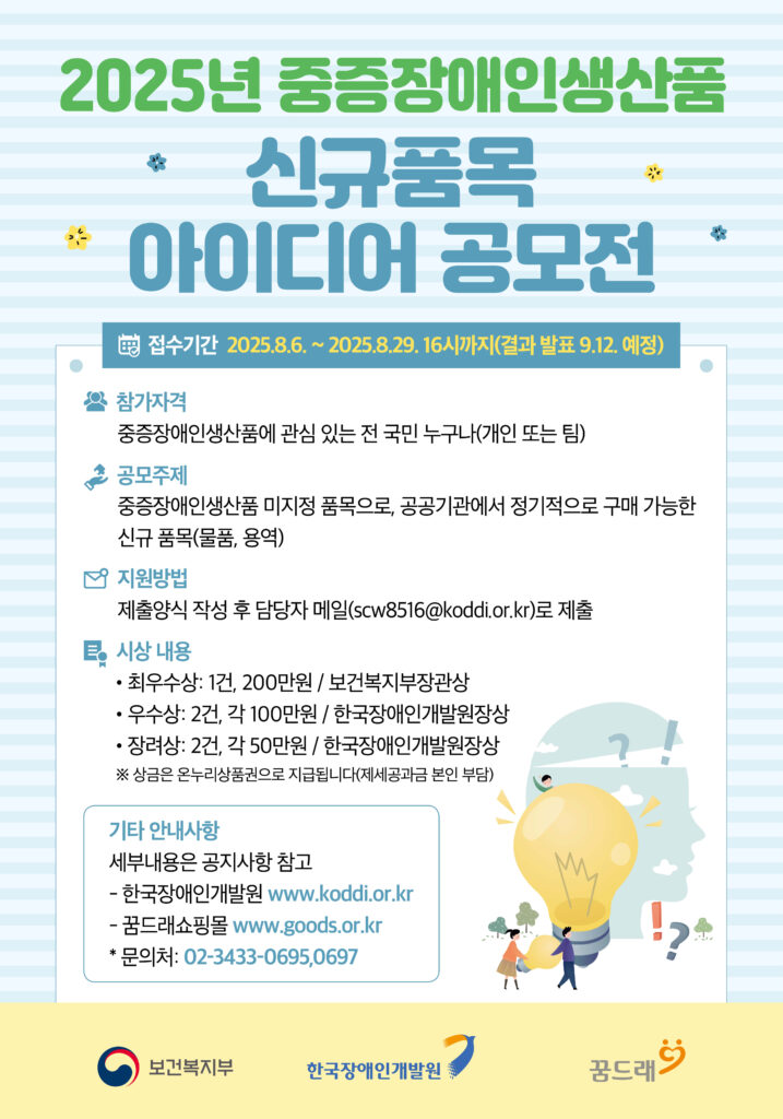 한국장애인개발원이 중증장애인의 경제적 자립을 지원하고 생산시설의 시장 경쟁력을 강화하기 위해 ‘중증장애인생산품 신규 품목 아이디어 공모’를 실시한다.