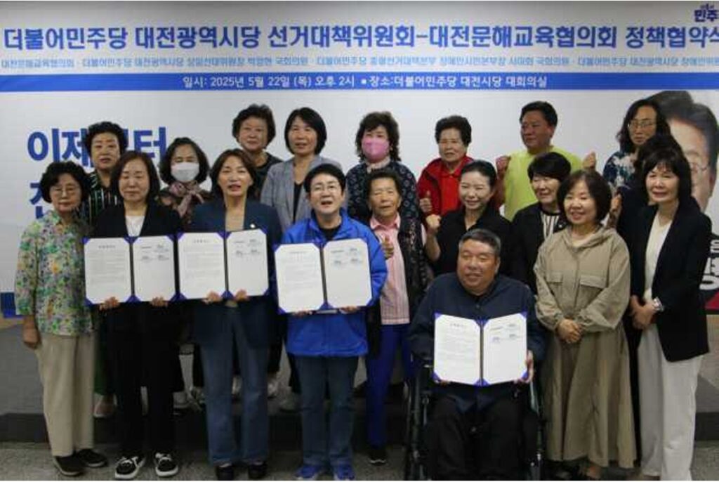 더불어민주당 진짜 대한민국 중앙선대위 장애인시민본부(본부장 서미화)가 22일 대전광역시당 사무실에서 대전 지역 장애인 관련 단체들과 정책협약을 체결하고, 장애인 당사자 및 가족들과 함께 이재명 대선 후보에 대한 지지를 공식 선언했다.