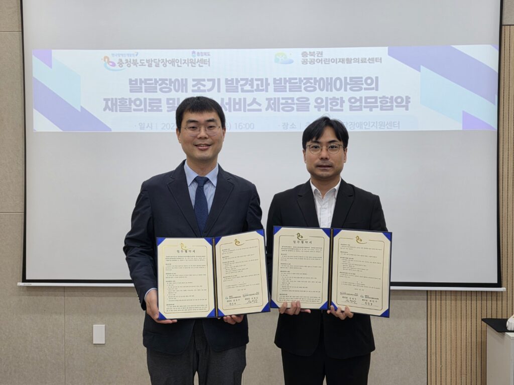 한국장애인개발원 충청북도발달장애인지원센터(센터장 김정인, 이하 충북발달센터)는 충북권공공어린이재활의료센터(센터장 권인수, 이하 어린이재활의료센터)와 24일 충청북도 내 발달장애 아동의 조기 발견과 재활의료 연계를 위한 업무협약을 체결했다.