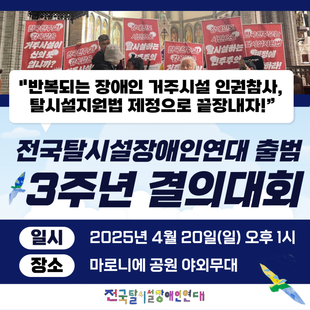 이들은 특히 “장애인이 지역사회에서 자립적으로 살아갈 수 있도록 지원하는 탈시설지원법이 현재 22대 국회에 발의되어 있으나, 아직 통과되지 못하고 있다”며, “정책 논의 과정에서 탈시설 당사자의 목소리는 여전히 충분히 반영되지 않고 있다”고 지적했다. 지난 2월 국회를 통과한 ‘장애인의 지역사회 자립 및 주거 전환 지원에 관한 법률’에서조차 ‘탈시설’이라는 표현이 제외된 점도 비판의 대상이 됐다.