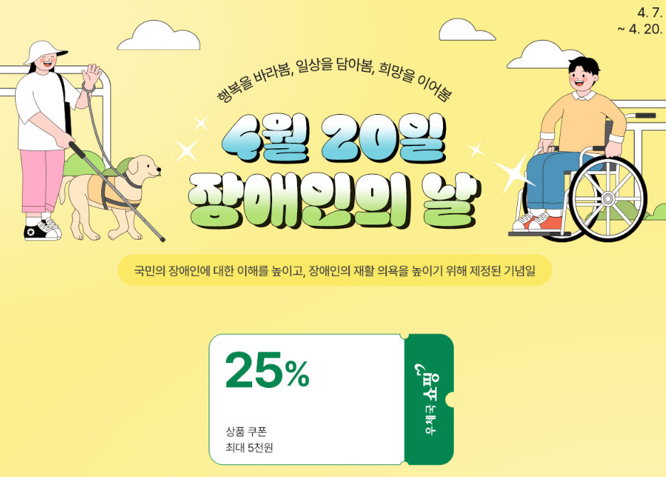 한국장애인개발원 4.20.한 우체국쇼핑몰 ‘장애인의 날 특별전’ 최대 25% 할인 쿠폰 제공