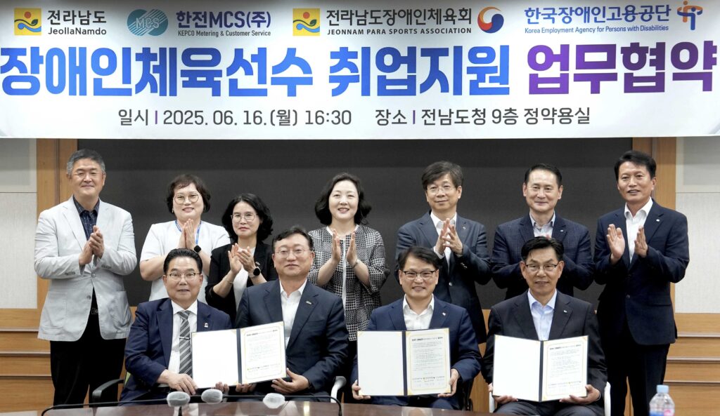 한국장애인고용공단(이사장 이종성)과 한전MCS㈜(대표이사 정성진), 전라남도장애인체육회(회장 김영록)는 6월 16일(월) 전라남도청에서 장애인 체육선수의 고용지원을 위한 ‘장애인 고용증진 업무협약’을 체결했다.