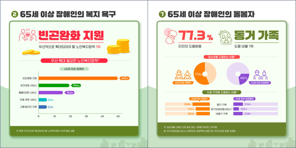조사에 따르면, 65세 이상 장애인이 향후 가장 확대되기를 바라는 복지정책은 ‘빈곤 완화 지원’으로 49.9%에 달했다. 이어 ‘보건의료 서비스’(19.4%), ‘돌봄(요양) 서비스’(15.4%) 순으로 나타나, 경제적 어려움과 일상생활 지원에 대한 요구가 큰 것으로 분석됐다.