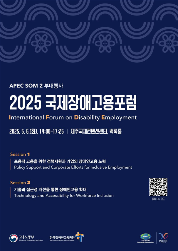 오는 5.6.(화) 제주국제컨벤션센터에서 열리는 2025 국제장애고용포럼(이하 포럼) 참가자 사전신청을 4.17.(목) 자정까지 홈페이지를 통해 받는다. 이번 포럼은 2025 아시아태평양경제협력체(APEC) 고용노동부장관회의(이하 SOM 2, Senior Officials’ Meeting 2)의공식 부대행사이다.